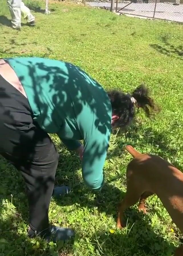 A grassy yard is being mowed by a person in a white suit using a gas-powered lawn trimmer. A person in a green shirt is bending down near a brown dog in the foreground. There are some low trees around the edge of the lawn. The sky is blue and the light is bright.