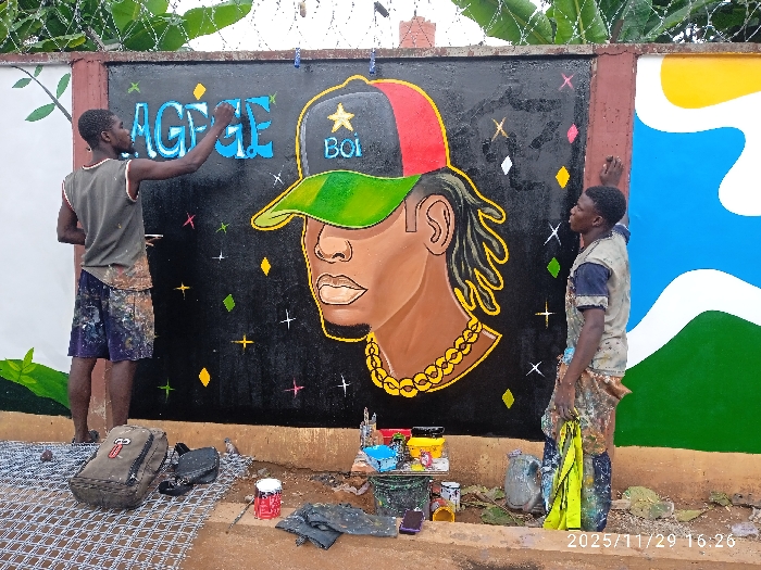 Two males are depicted painting a mural on an outdoor wall in Agege, Nigeria, at approximately 4:26 PM on November 29, 2025