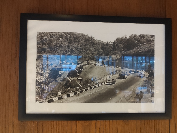 A black and white photograph depicting a historical outdoor scene in Ciloto, Indonesia, is displayed in a black frame with a white mat, mounted on a wooden paneled wall