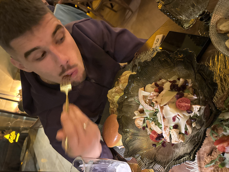 A male subject is depicted in an indoor dining establishment in Căciulați, Romania. He is observed from the chest up, with short dark hair and light facial stubble, wearing a dark purple zippered hoodie. A gold-colored fork is held in his right hand, positioned near his slightly open mouth. On the dark, reflective table in front of him, a large, dark glass bowl holds a salad containing greens, croutons, cherry tomato halves, shaved cheese, and dried cranberries. Adjacent to the salad, a plate features a burger bun and a pile of golden-brown chips. A glass containing a foamy beverage is visible to the left. A small wooden block marked "6" and a dark smartphone are also present on the table surface. The background is blurred, showing additional patrons, chairs, and a partially visible neon sign through a glass partition, characteristic of a restaurant or bar environment with dim, warm lighting.