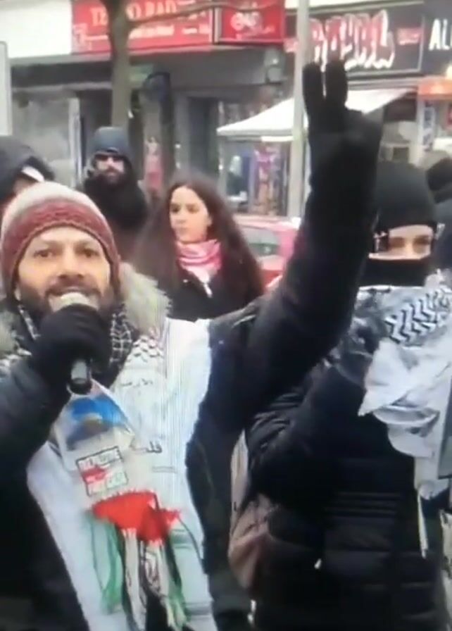 Here is a detailed description of the video: The video shows a group of people gathered in what appears to be a street protest or demonstration. The focus is on a man in the foreground speaking into a microphone. He is wearing a beanie hat, a scarf, and a white garment adorned with what seem to be emblems or patches. Some of the emblems appear to be related to Palestinian identity, including a Palestinian flag. He is holding what appears to be a scarf or flag with the Palestinian colors. He gestures with his left hand while speaking. Around him are other individuals, some wearing scarves or masks. Several people in the group are raising their hands, some with one finger up, and others with peace signs. In the background, there are commercial buildings with signs in Arabic or a Middle Eastern language, suggesting the location might be in a city with a significant Middle Eastern population or a neighborhood with Middle Eastern businesses. A red car is visible in the background, and the weather seems cold, with people wearing winter clothing. The general atmosphere is that of a rally or demonstration focused on Palestinian issues.