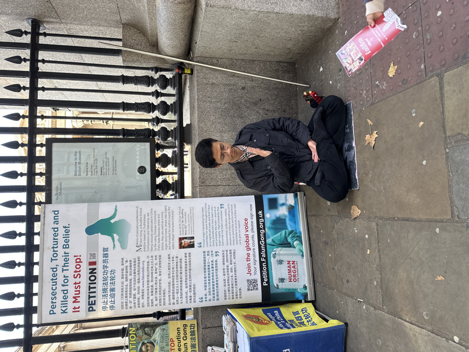 An outdoor scene captures an awareness event on the flagstone pavement outside the British Museum in London, United Kingdom, identifiable by a visible museum sign behind a black metal railing. A young East Asian male, wearing glasses, a plaid shirt, dark jacket, and dark trousers, is seated cross-legged on a dark mat, meditating with hands clasped in a prayer gesture. To his immediate left, a large white banner stands upright. This banner features English text stating: "Persecuted, Tortured and Killed for Their Belief. It Must Stop! PETITION," alongside Chinese text, information about Falun Gong and forced organ harvesting, a QR code, the website "Petition.FalunGong.org.uk," and an image of a "HUMAN ORGAN FOR TRANSPLANT" cooler. A partially visible yellow and blue display stand with Chinese text is located further to the left. The background features an ornate black metal railing fronting a stone building. A sign for "The British Museum," displaying opening hours and a "Starbucks" logo, is visible through the railing. The grey flagstone pavement is scattered with several dried brown autumn leaves. A long, slender metallic pole leans against the building wall to the right of the meditating male. In the lower right corner of the frame, a hand holds a red pamphlet featuring multiple small photographic portraits.