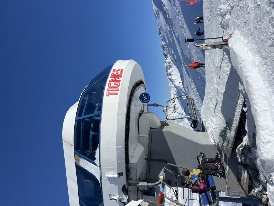 The image depicts a ski lift terminal at a ski resort in Tignes, France, on a clear, sunny day