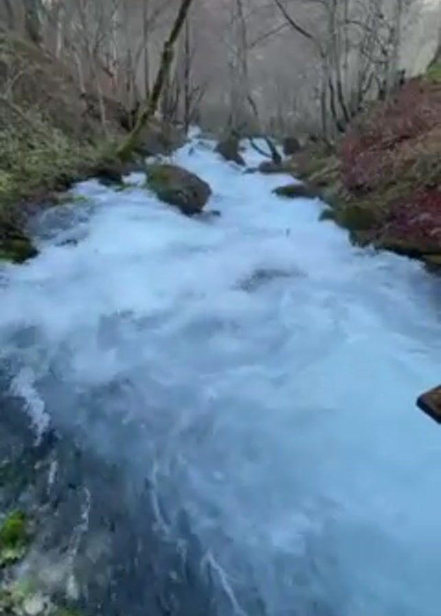 fast-flowing, wide stream cascading through a forest. The water is a milky blue-white color, full of froth and rapids as it rushes downstream. Large rocks are scattered within the stream, some covered with green moss. Bare trees line both banks of the stream, their branches creating a canopy above. The forest floor is covered with leaf litter and moss. The camera appears to be stationary, providing a steady view of the scene.