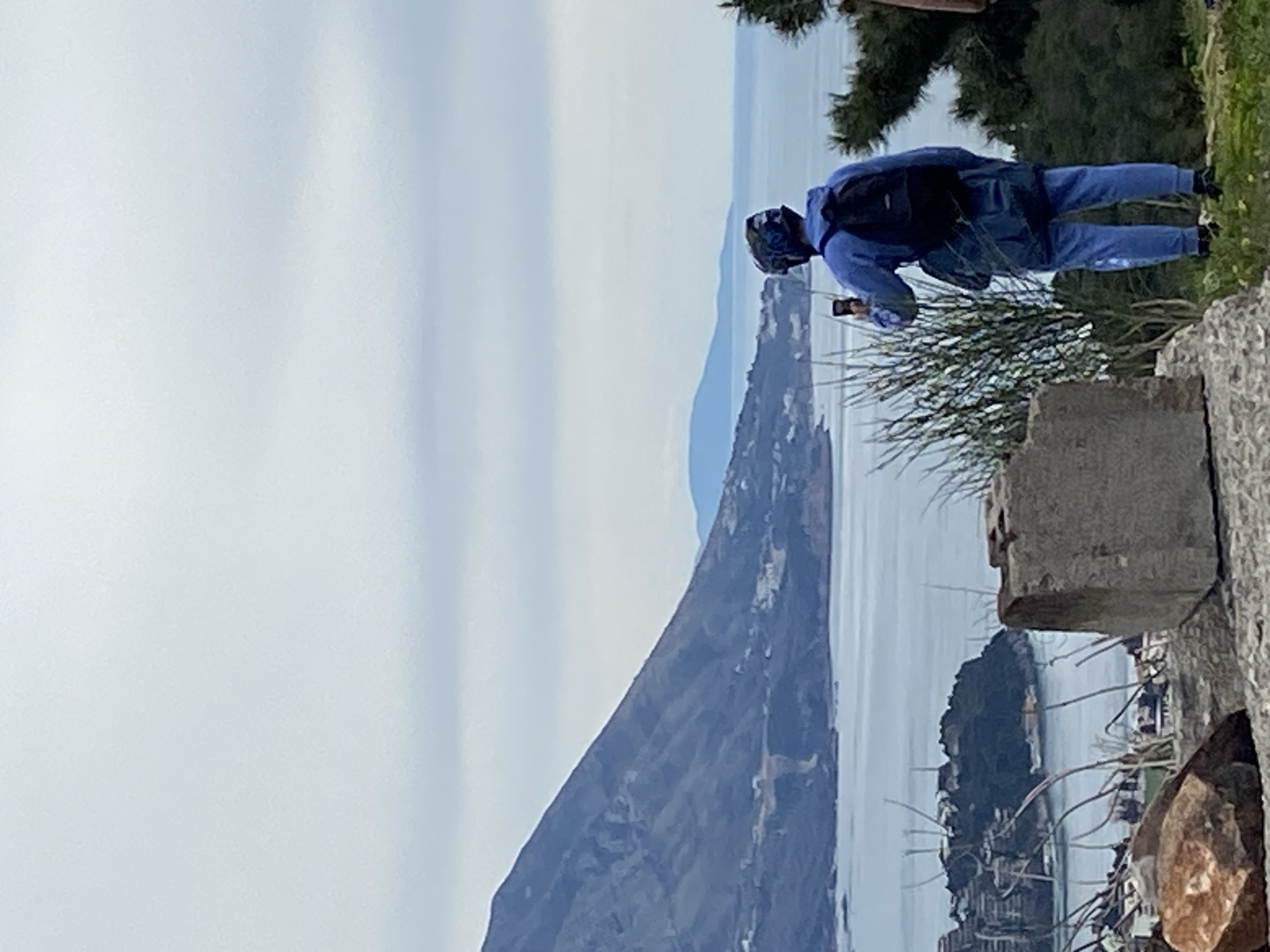- "A person wearing a blue tracksuit and a dark backpack is standing on a stone structure, using a phone to take a photo of a mountainous landscape and a body of water" by FM-rv1Bv1, licensed under CC BY 4.0