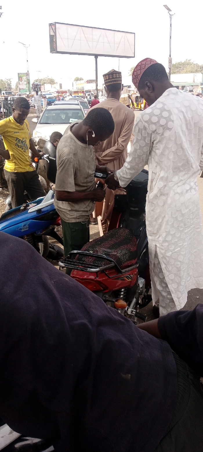 The image depicts an outdoor urban street scene in Fagge D2, Nigeria, occurring during daylight