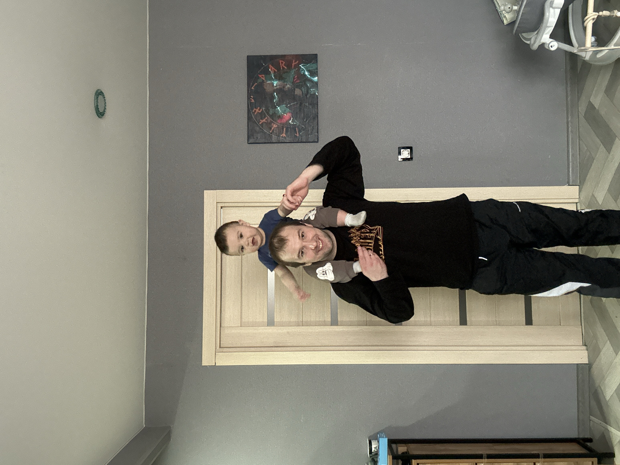 A man is lying on his back, supporting a small child on his shoulders. The man is wearing a black long-sleeved shirt and black sweatpants with white stripes. The child is wearing a blue shirt and grey pants with white socks. They appear to be holding hands. Behind them is a closed wooden door with vertical panels. On the wall above the door is a dark, square piece of artwork with the word "DARK" visible. A green, circular object hangs on the wall to the left. In the upper right corner of the image is what appears to be a white baby swing. The floor is tiled. The location is a room in a house or apartment in Chaikovsky, Russia.