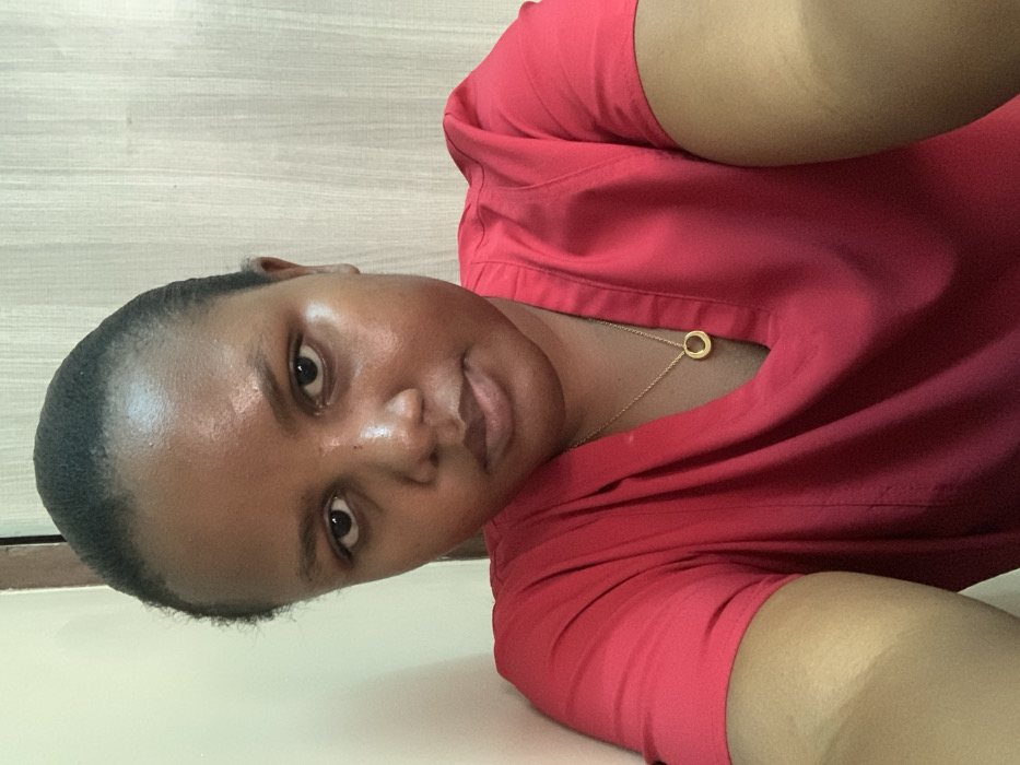 This image presents a close-up, upward-angled shot of a single adult female in an indoor setting located in Dar es-Salaam, Tanzania. The subject, identifiable by her dark skin and dark hair pulled back, is wearing a solid red V-neck top. A thin gold-colored chain necklace with a small, circular, open-ring pendant is visible around her neck. Her face, exhibiting a slight sheen, is directed towards the camera with a neutral expression. The background consists of a plain, light beige wall on the left side of the frame and a vertically paneled, light brown wall or door on the right. No other individuals or significant objects are present within the frame. The scene is illuminated evenly, consistent with an interior light source.