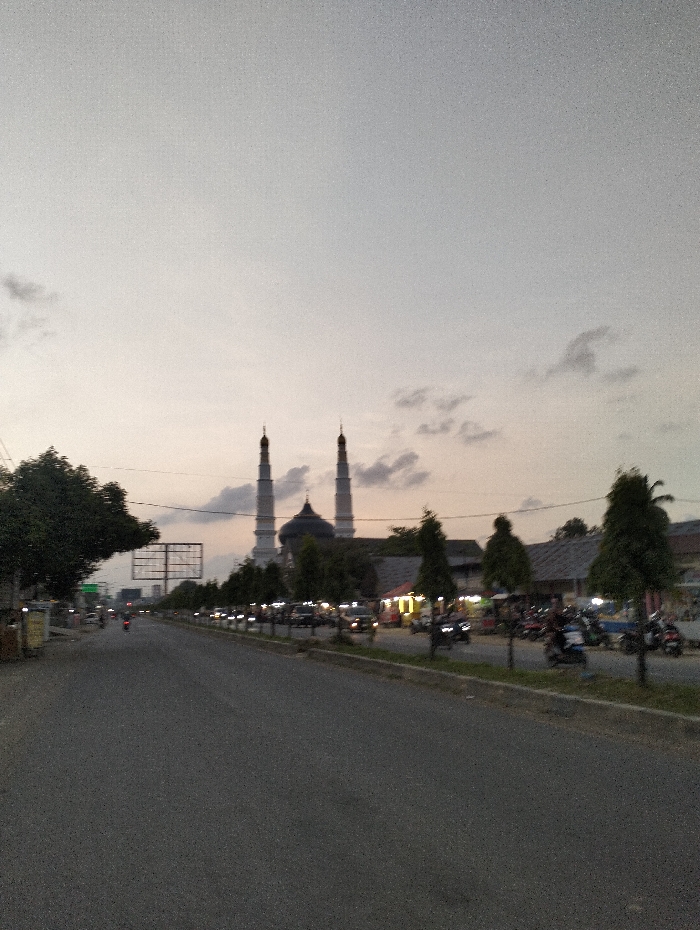 The image displays an urban street scene in Payacut, Indonesia, observed during dusk or dawn. A wide, dark asphalt road dominates the foreground and extends into the mid-distance. In the background, a large mosque featuring a central dome and two prominent minarets is visible, appearing light-colored against the fading sky. The sky is largely overcast, showing a gradient from light grey to pale orange near the horizon with scattered clouds. Along the right side of the road, a planted median contains a uniform row of conical trees. Behind these trees, multiple single and two-story commercial buildings are present, some exhibiting artificial illumination. A collection of motorcycles and a few cars are either parked or in motion on this side of the street. On the left side of the road, a large, empty billboard structure is discernible in the distance, alongside sporadic foliage. A single motorcycle with a rider is observed in transit in the left lane, heading away from the viewer. Additional vehicles, including cars with activated headlights, are visible further down the road, indicating ongoing traffic.