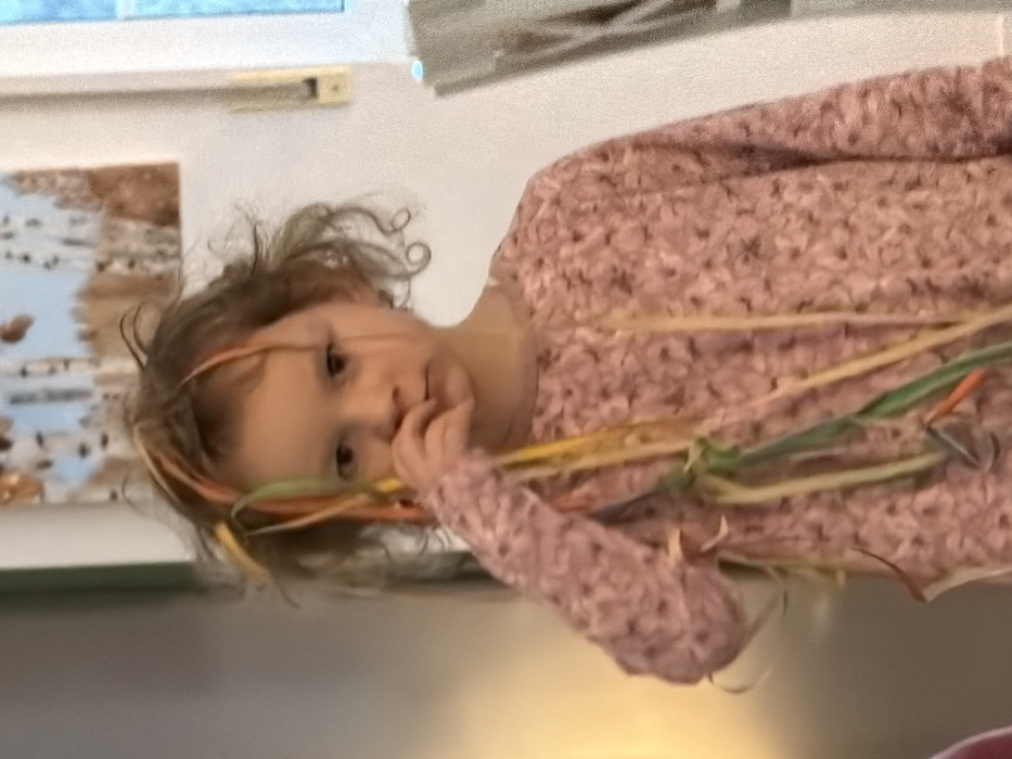A young child with curly blonde hair and a pink patterned shirt is seen. The child is touching her face with her hand, and several colorful strands are draped across her body and head. A painting with brown and blue hues hangs in the background on a wall. The image appears to be taken indoors, with a bright light source.