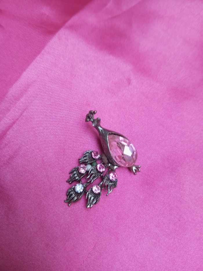 A silver-toned metal brooch, depicting a peacock, is positioned centrally on a bright pink textile surface