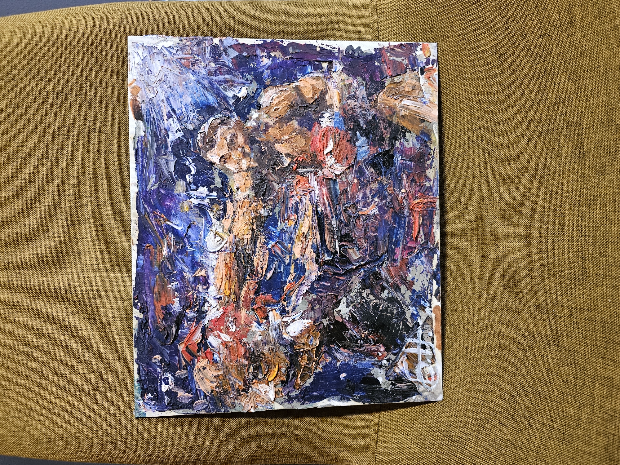 A rectangular, unframed impasto oil painting depicting a boxing match is displayed horizontally on a textured mustard-brown fabric surface. The artwork features two male figures engaged in combat, rendered with thick, visible brushstrokes primarily in dark blues, purples, blacks, reds, oranges, browns, and whites. The figure on the left is depicted in red and orange, extending a red-gloved punch towards the figure on the right. The right figure, showing a muscular torso in brown and orange tones, wears red gloves and appears to be reacting to an impact. The background is abstract and dynamic, composed of swirling dark colors with bright accents. A faint white signature or mark is partially visible in the bottom-left corner of the painting. The fabric surface appears to be upholstery, possibly a chair or sofa, within a room. The scene's location is Unknown, Unknown.
