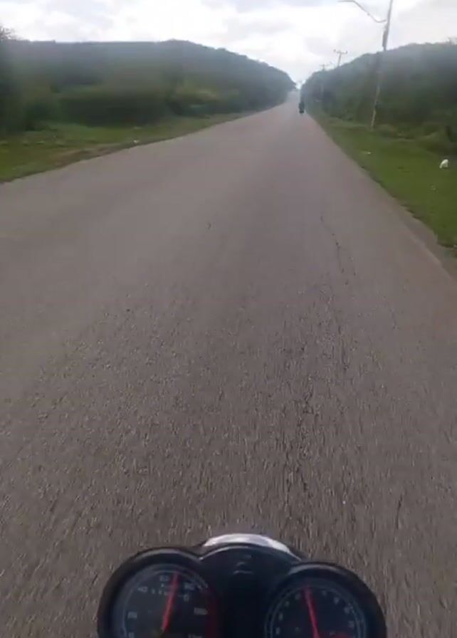 The viewpoint is that of someone riding a motorcycle on a paved, but cracked, road. The speedometer indicates a speed of approximately 60 km/h. There's another motorcycle visible far ahead on the road. The surroundings are rural, with green vegetation, hills, and utility poles lining the sides of the road. The sky is partly cloudy.