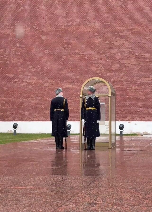 Two guards in black uniforms and furry hats stand in front of a red brick wall on a wet, brown brick surface during a light snowfall