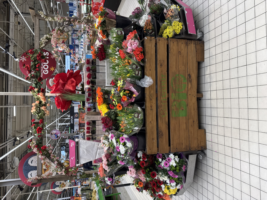A flower stand overflows with vibrant bouquets: roses, tulips, gerberas, and mixed arrangements, all neatly wrapped in clear cellophane. The flowers sit in black buckets and on a weathered wooden pallet with green stenciled lettering. Overhead, a decorative floral archway frames signs and advertisements, adding a festive touch to the supermarket aisle with its white tiled floor and metal ceiling.