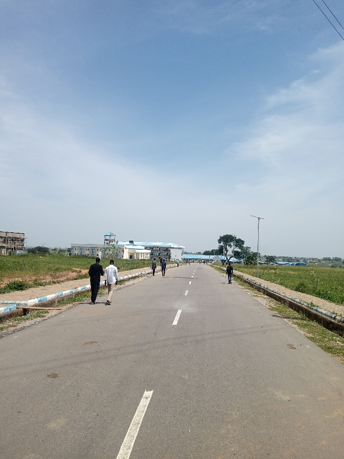 The image displays a wide-angle view of a paved asphalt road in Hayin Banki, Nigeria, extending linearly into the background under a mostly clear blue sky with sparse white clouds. **People:** Approximately eight individuals are observed walking along or adjacent to the road, generally moving away from the camera toward the background. In the foreground-left, two adult males are walking side-by-side: one wears a dark long-sleeved shirt and dark trousers, the other a white long-sleeved shirt and light-colored trousers. Other individuals are further down the road, less distinctly visible, casually dressed. **Road:** The road is asphalt, appearing two-laned, with faded white dashed lane markings in the center. Its surface shows minor wear and discoloration. Concrete curbs, painted with alternating blue and white stripes, delineate both sides of the road. **Left Environment:** Beyond the left curb is an undeveloped strip of earth, followed by an expanse of green, uncultivated land with sparse vegetation. In the mid-distance on the left, a multi-story building under construction, characterized by exposed concrete and scaffolding, is visible. Further back, several completed, modern light-colored buildings with blue roofs are present, indicative of an institutional or campus setting. **Right Environment:** Beyond the right curb, a drainage ditch precedes an area of green vegetation, similar to the left side but potentially wilder. A tall, slender streetlight pole with a mounted solar panel array stands on the right side of the road in the mid-distance. A large, mature tree with dense foliage is visible further back on the right, obscuring some distant structures. More buildings with blue roofs are discernible in the far distance on the right. **Sky and Lighting:** The upper portion of the image is dominated by a bright blue sky, with minimal, thin white cloud cover. The scene is brightly illuminated by natural sunlight, suggesting fair weather and midday conditions.