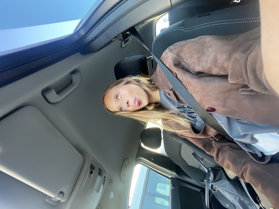 A young woman is seated in the front passenger seat of a vehicle, located in Senhora da Hora, Portugal. She has long blonde hair and light-colored eyes. Her head is tilted slightly upwards and to the left, with her tongue extended from her mouth. She is wearing a brown, collared jacket, possibly suede, over a grey t-shirt with a white graphic text. A black seatbelt is visible across her torso. A dark shoulder bag or small backpack is positioned on the floor in front of the passenger seat. The car's interior features dark-colored upholstery, a light-colored sun visor above the driver's side, an overhead console, and a grab handle above the passenger door. Through the driver's side window, a portion of a light-colored building with horizontal structures is visible. A clear blue sky is visible through the passenger's side window, indicating daylight conditions.