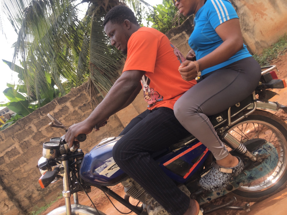The scene depicts two individuals seated on a blue motorcycle outdoors in Akpaka Forest Reser, Nigeria