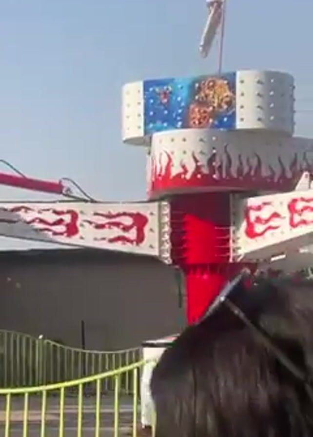 n amusement park ride called "Energy Storm" in operation. The ride consists of a central tower with rotating arms that lift and spin individual passenger cars. The ride's structure is primarily white with red flame accents. A small flag flutters on top of the tower. A yellow metal fence surrounds the ride. Several people stand watching, including a person with long red fingernails holding a phone and a security guard in a black uniform. The sky is clear and blue, suggesting a sunny day. The background includes trees and a glimpse of other park structures.
