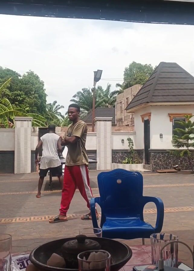 group of young men outside a building. Two of them are playing table tennis in the background. A man in a green shirt and red pants stands in the foreground with his arms crossed. In the background, three men are leaning on a balcony railing, observing the game. Another man walks past them towards the right. The scene is shot from under a structure with a solar panel roof. There is a table with glasses and a bowl in the foreground. The environment includes trees and houses in the background.