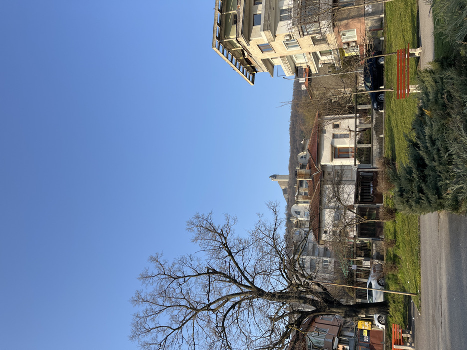 The image depicts an urban landscape in Shumen, Bulgaria, featuring residential structures, a public green space, and a prominent monument on a distant hill under a clear blue sky. In the foreground, an asphalt path or road is visible at the bottom edge. Immediately behind it, a manicured grassy area contains several low, evergreen bushes. Two empty park benches, constructed with wooden slats and concrete bases, are positioned within this green space; one is partially obscured on the left, and another is fully visible on the right. A large, bare deciduous tree with extensive branching occupies the left side of the frame, extending from the bottom to near the top. The midground features various residential buildings. On the left, a portion of a multi-story building with a light facade is visible, with a white sedan parked nearby. In the center, a series of older, single-family houses with light-colored exteriors and red-tiled roofs are arranged, some fronted by fences. On the right, a taller, multi-story apartment building with exposed concrete elements on its roof and balconies is present, with a black sedan parked in front. Additional bare deciduous trees are scattered among these buildings. In the background, a large, tree-covered hill rises, dominated at its summit by the Monument to 1300 Years of Bulgaria, a substantial concrete structure. The sky above is entirely clear and bright blue, without clouds. No individuals are visible within the scene, and no overt actions or interactions are depicted. The lighting suggests a clear day, possibly morning or late afternoon, and the bare trees indicate winter or early spring.