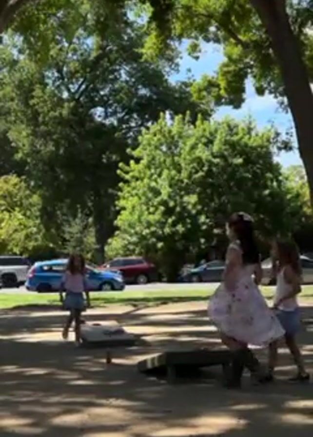 three young girls playing cornhole on a sunny day in a park-like setting. The girls are dressed in casual summer clothing. One girl wears a floral dress and boots, while the other two wear skirts and tops. They are taking turns throwing bean bags at the cornhole boards. The surroundings include green trees, grass, and parked cars in the background. There is audible conversation that suggests the game is taking place among other people. The camera remains relatively still, capturing the children's activities.