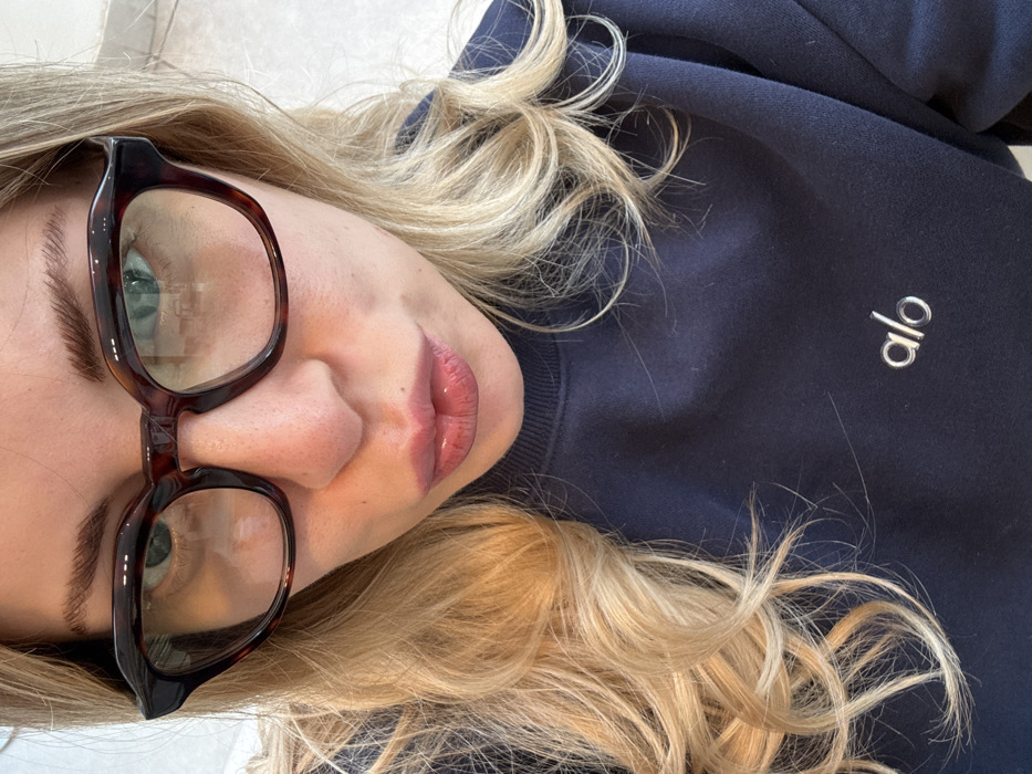 A close-up selfie depicts a Caucasian female subject indoors in Saint-Ouen-sur-Seine, France. The woman has long, wavy blonde hair and is wearing thick-framed, brown tortoiseshell glasses. Her light-colored eyes are visible through the lenses, which exhibit reflections. Her dark eyebrows are well-defined. Her lips are pursed in a "kiss" expression, coated with a light pink gloss. She wears a dark blue crew-neck sweatshirt featuring the silver-colored "alo" logo embroidered on the left chest. The background is an out-of-focus, light-colored surface, indicating an interior setting.
