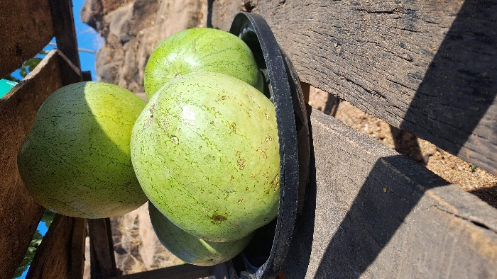 Four light green, unripe watermelons are in a dark-colored container. The watermelons have light and dark-green speckles. The container is sitting inside a weathered wooden crate. One side of the crate is mostly in shadow. In the distance, more trees and possibly hills are visible under a clear blue sky. Sand or light-colored dirt is beneath the crate.
