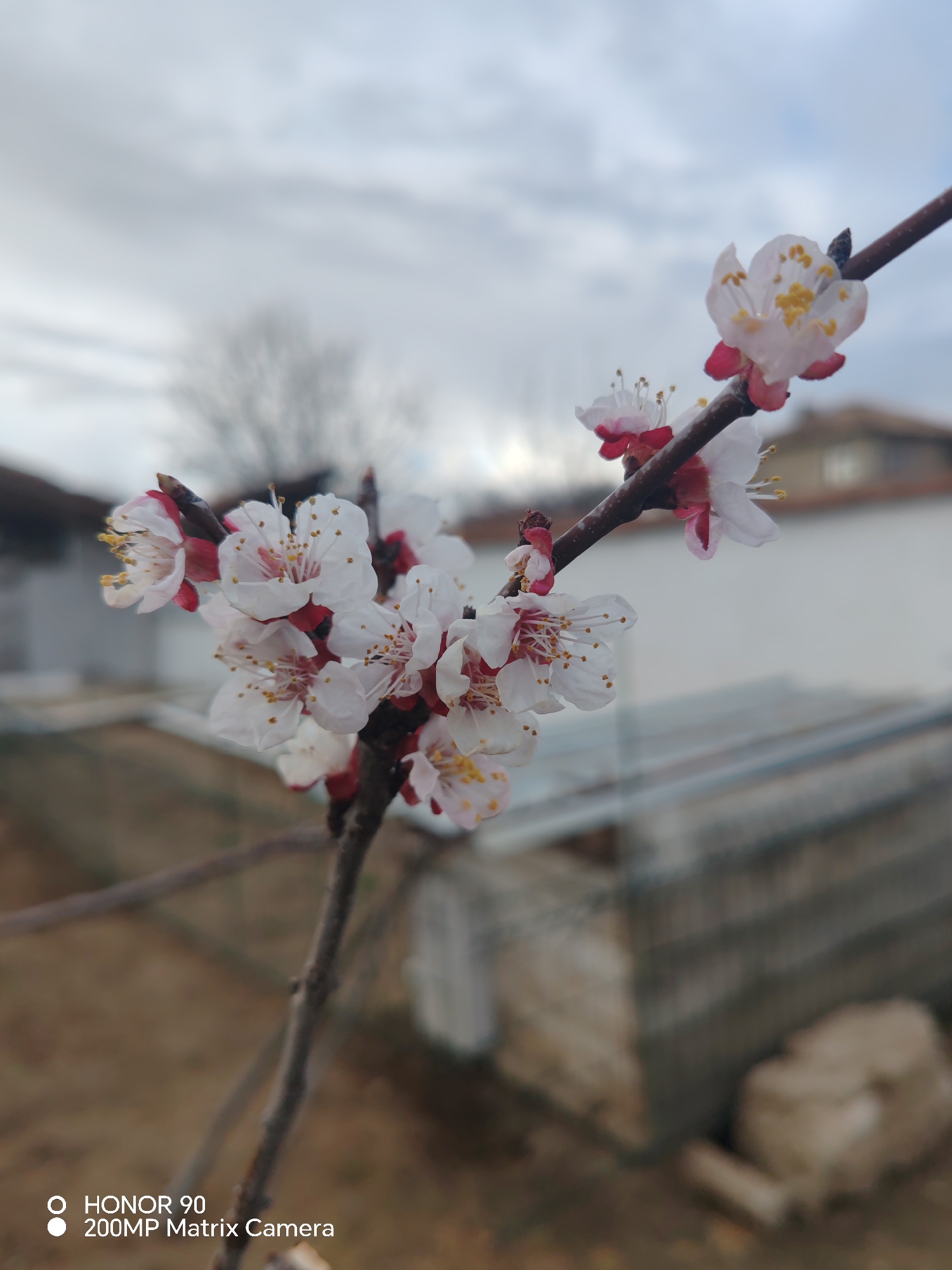 The image forensically captures a sharply focused segment of a flowering deciduous tree branch, situated in Rosen, Bulgaria. The branch extends diagonally from the lower-left to the upper-right, featuring multiple clusters of open blossoms. Each flower displays white petals with distinct reddish-pink coloration at their bases, and prominent yellow anthers are visible in the center of each bloom. The background is heavily blurred due to a shallow depth of field. Indistinct elements in the background include a white-walled building with a dark-colored roof on the right, and partial structures resembling other buildings or fences on the left. A leafless tree is silhouetted against an overcast, grey sky in the upper portion of the frame. The ground visible at the bottom consists of blurred earthy tones and indeterminate light-colored debris. No human figures, animals, or specific actions are depicted.