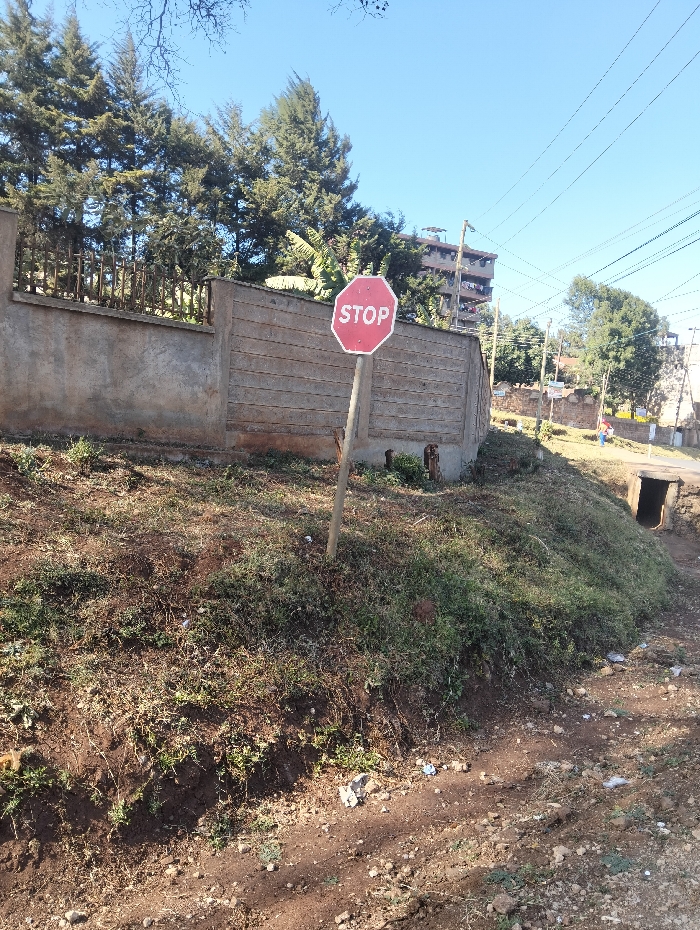 The image depicts an unpaved dirt path and an adjacent sloped terrain in Ngong ward, Kenya, under a clear blue sky. A prominent red octagonal STOP sign on a light-colored pole is centrally positioned on the grassy and earthen slope. To the left, a concrete wall with a dark metal fence runs horizontally, backed by a dense line of tall, dark green coniferous trees. Bare tree branches are visible against the sky in the upper left. To the right of the STOP sign, the dirt path continues, revealing a dark rectangular concrete culvert opening at ground level. Overhead, multiple utility wires traverse the scene, supported by partially visible poles. In the background, a multi-story building is visible through trees, with what appears to be laundry hanging from balconies. In the far distance to the right, a small human figure wearing a blue shirt is faintly discernible near a low structure. The foreground consists of dry soil mixed with sparse green grass and scattered litter. No specific actions or interactions are clearly depicted.
