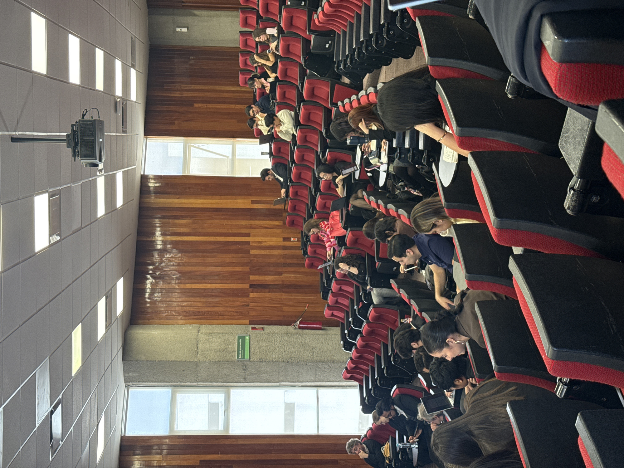 An auditorium in Ciudad López Mateos, Mexico, is depicted from a raised, mid-level perspective, showing approximately 35-40 individuals seated in tiered, red and black upholstered chairs. The room features a grid-patterned false ceiling with numerous rectangular fluorescent light panels, from which a dark-colored projector is suspended centrally. The walls are composed of a lower section of light gray, textured concrete, and an upper section of dark, vertical wooden paneling. Large, multi-paned windows on the left side allow natural light into the space. A red fire extinguisher is mounted on the concrete wall below a green "Ruta de evacuación" sign with an arrow pointing right. Attendees, predominantly young adults of varying genders, occupy rows of seats equipped with individual flip-up tables. Many individuals are actively engaged with electronic devices, including laptops and mobile phones placed on their tables. Some are observed looking towards the front of the room (out of frame), while others are focused on their devices or conversing quietly. Visible objects include water bottles, notebooks, and pens on the individual tables. The overall activity suggests a lecture, presentation, or academic session.