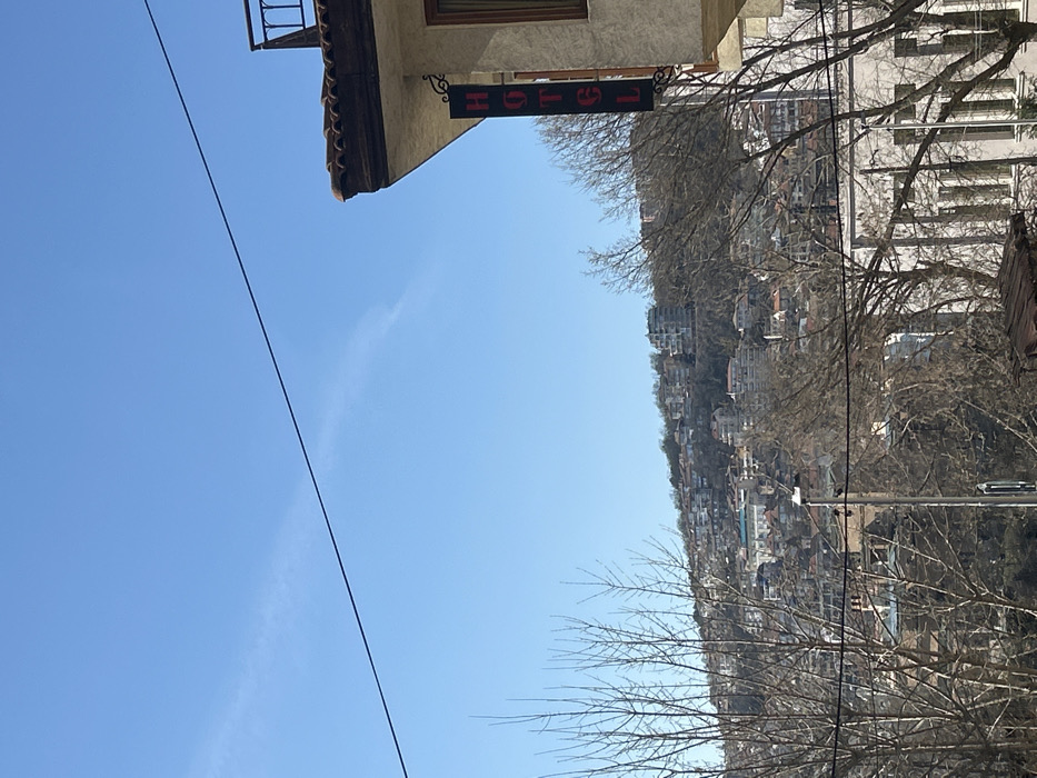 The image presents a daytime urban scene in Veliko Tarnovo, Bulgaria, under a clear blue sky. In the foreground, on the right, the corner of a building with light-colored stucco walls and a terracotta-tiled roof is visible. A black vertical sign, displaying the word "HOTEL" in red capital letters, is affixed to this corner. Above the building's edge, a black wrought-iron railing is present. A single dark cable or wire traverses the upper portion of the frame horizontally. The midground features numerous bare deciduous trees, their branches devoid of leaves, obscuring parts of the view. A utility pole is discernible among the trees. The background consists of a steep, densely developed hillside, characteristic of Veliko Tarnovo's terraced architecture. The hillside is covered with numerous multi-story buildings, predominantly residential or commercial, featuring various architectural styles and colors, many with light facades and tiled roofs. Sparse vegetation is interspersed throughout the built environment on the slope. The sky is clear blue with minimal high-altitude cloud formations or contrails visible. No individuals or specific activities are depicted.