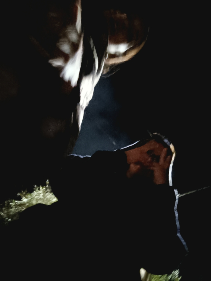 In the low-lit image, a horse's head dominates the upper portion, its brown and white markings barely discernible in the dimness. Below, a person in a dark jacket appears to be interacting with the horse. The individual's face is visible, hands raised near their head. Patches of vegetation are visible in the lower portion. The overall scene is shrouded in darkness, making details indistinct.