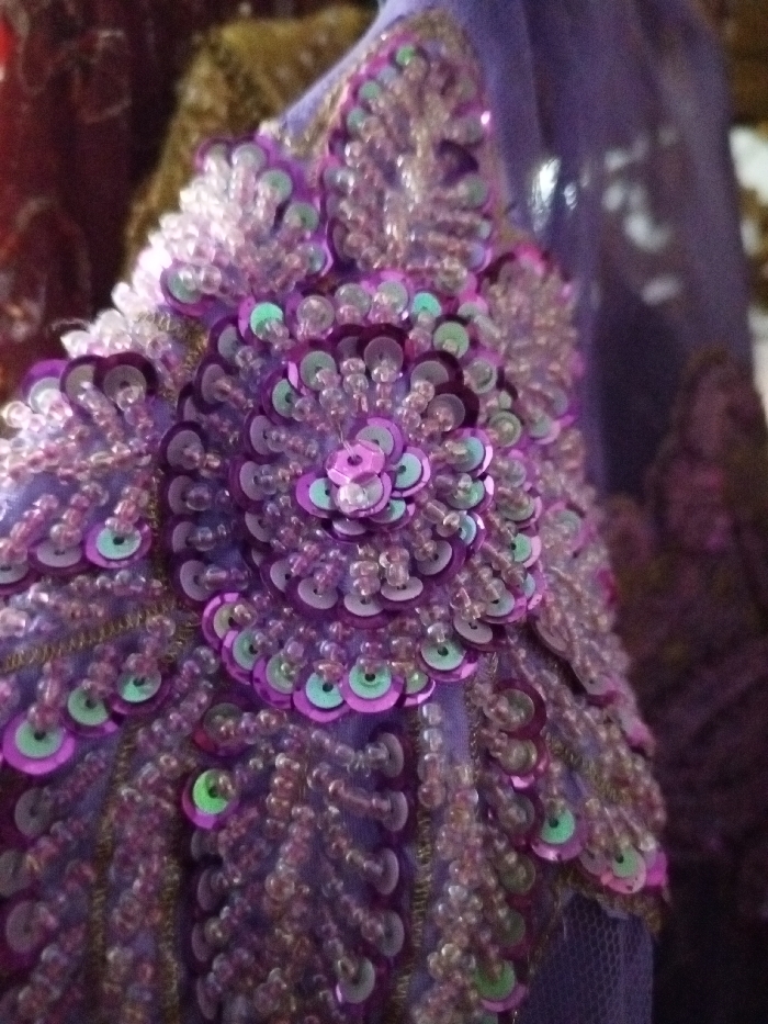 This image, captured in the city of Phakeo, Laos, displays a detailed close-up of an embellished purple textile