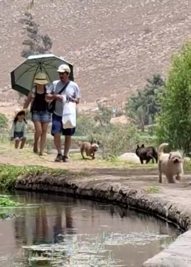 A family is walking on a dirt path beside a narrow body of water. The family consists of an adult male, an adult female, and a young child. The man is wearing a light-colored shirt, dark shorts, a hat, and carrying a white bag over his shoulder. The woman is wearing a black top, a short denim skirt, and a straw hat, and is holding a large umbrella. The child is wearing a long-sleeved shirt, shorts, and a straw hat. Three small dogs are running ahead of them on the path. The environment consists of a green area with a stream of water, greenery, and trees, with a large hill or mountain in the background. The overall setting appears to be outdoors and sunny.