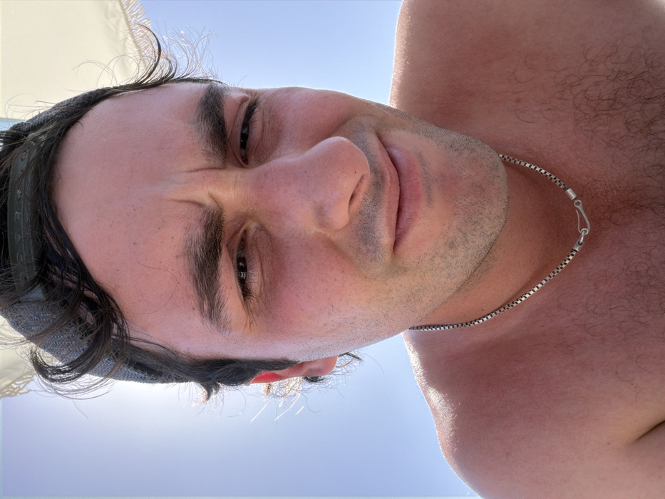 A close-up portrait of a man with dark hair and eyes, taken from a low angle, suggests he's holding the camera above him. He's wearing a gray cap and a silver chain around his neck. The background is a bright blue sky with a hint of sunlight. The man has fair skin and appears to have some stubble. His expression is a slight smirk.