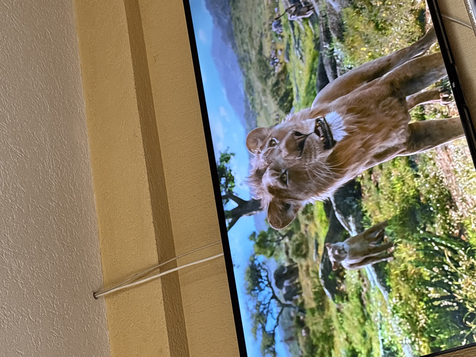This image depicts an indoor scene in Mikrevo, Bulgaria, focusing on a television display. The top third of the image shows a textured, off-white ceiling. A thin, white cable descends vertically from a small circular opening in the ceiling, running along the textured, light beige wall or structural beam that frames the top of the television screen. The lower two-thirds of the image capture a widescreen television. The bottom right edge of the television's bezel partially displays the brand name "TCL." The screen presents a computer-generated outdoor savanna environment under a blue sky with some clouds. In the foreground, a light brown, partially maned adult lion stands centrally, facing slightly right and looking upwards with its mouth slightly ajar, revealing teeth. To the left in the middle ground, a smaller, darker brown lioness or juvenile lion is visible standing on rocks. The background features green and yellowish grasses, scattered rocks, several sparse trees, and distant mountains. Faint, dark shapes resembling elephants are discernible in the far left background.