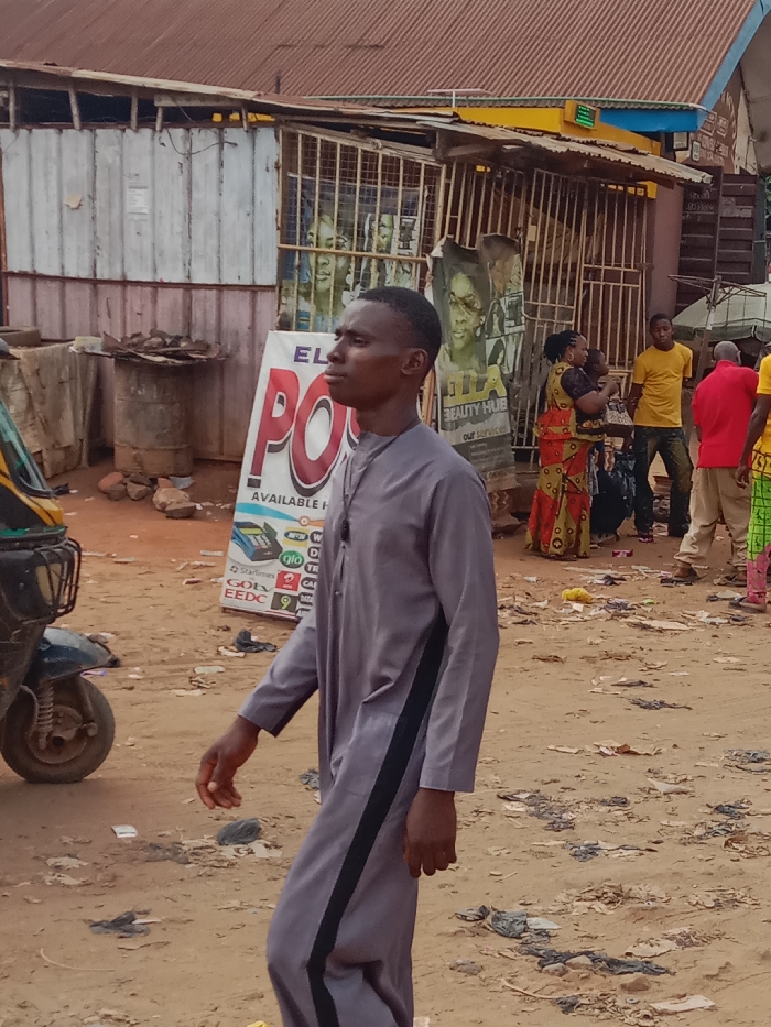 An outdoor scene in Onitsha, Nigeria, depicts a bustling, unpaved commercial area. In the foreground, a dark-skinned male, approximately 20-30 years old, walks from left to right, looking straight ahead. He wears a grey long-sleeved tunic with a vertical black stripe on the outer right leg and a dark pendant around his neck. To his left, the front wheel and fender of a green and yellow tricycle are partially visible. The midground features uneven, dirt ground heavily littered with debris. A large white signboard, advertising "EL PO" in red, stands prominently. Below "EL PO," text indicates "AVAILABLE HERE" and lists logos for various services including StarTimes, GLO, EEDC, DSTV, and GOTV. Behind this sign, a group of individuals stands. One dark-skinned woman wears a multi-colored patterned dress and appears to be holding a child. A dark-skinned man in a yellow t-shirt and dark pants stands nearby. Other figures are partially obscured. The background consists of several makeshift commercial structures under a reddish-brown corrugated metal roof. The leftmost structure has corrugated metal siding and a large, dark drum topped with debris in front of it. Adjacent to it, another structure features a barred window or gate behind which various posters, including one for "GILA BEAUTY HUB," are displayed. A small green sign with yellow text is mounted above. The general environment indicates an urban market or street setting.