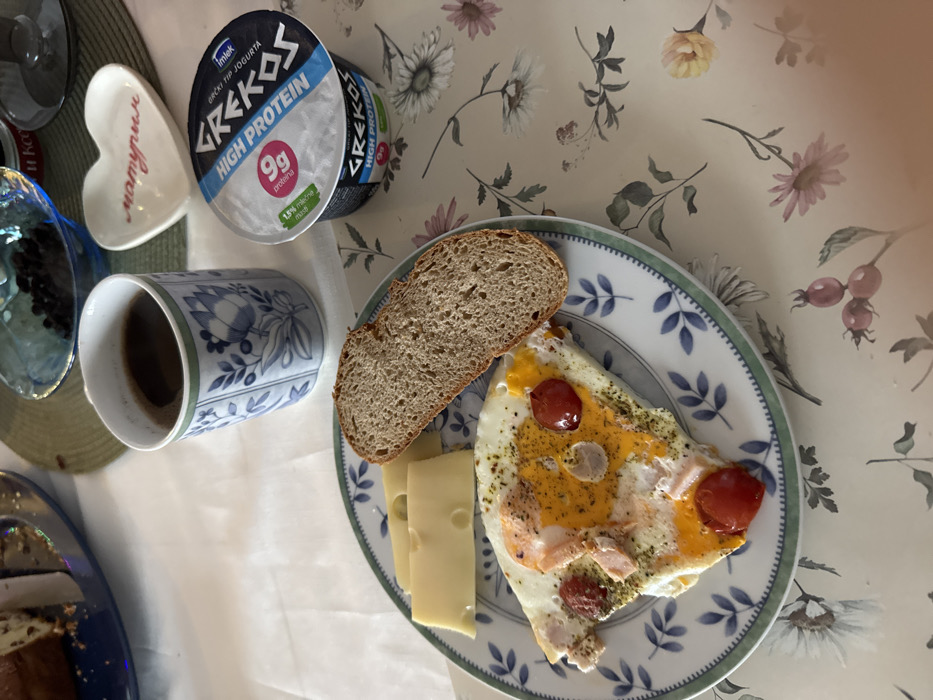 An overhead shot depicts a breakfast setting on a table in Novi Sad, Serbia. The table is covered with a light-colored floral tablecloth featuring various flowers and rose hips. Central to the frame is a round plate with a blue and white decorative rim, holding a portion of fried eggs or an omelet garnished with cherry tomatoes and possibly ham or salmon, accompanied by three slices of pale yellow, hole-punched cheese (resembling Emmental) and a slice of dark, whole-grain bread. To the right of the plate, a blue and white patterned mug contains a dark beverage, likely coffee. Adjacent to the mug, an Imlek Grekos High Protein yogurt cup is present, displaying "9g protein" and "Grčki tip jogurta" text. A small, white, heart-shaped dish with "матурин" (maturin) written in pink Cyrillic script rests near the yogurt. Further in the background, a blue glass bowl contains dark berries, and a partially consumed cake sits on a blue platter. No individuals are visible.