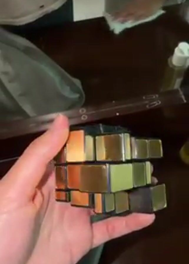 A hand holds a gold and black Mirror Cube in front of a mirror