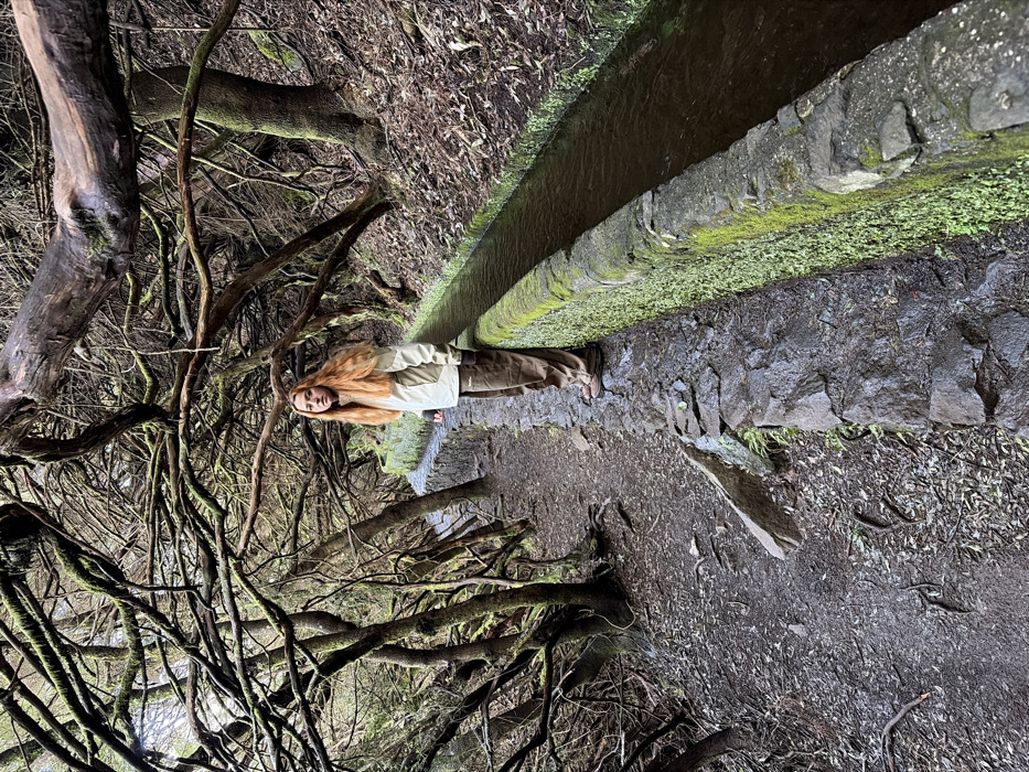 This image depicts a single individual on a hiking trail in Calheta, Portugal. A female subject, with long, wavy reddish-blonde hair, stands on a narrow, damp dirt path. She is wearing a light-colored (beige or khaki) long-sleeved jacket and dark brown trousers. Her footwear is brown. To her right, a stone-built water channel, characteristic of a 'levada,' runs parallel to the path. The levada's stone walls are extensively covered in green moss and small plants, and it contains dark, flowing water. The path itself is composed of dark soil, exposed roots, and scattered leaf litter. The scene is set within a dense forest, where numerous trees with dark, gnarled, and moss-covered branches form a canopy overhead, creating a shaded environment. The woman is positioned centrally, looking directly forward with a neutral expression.