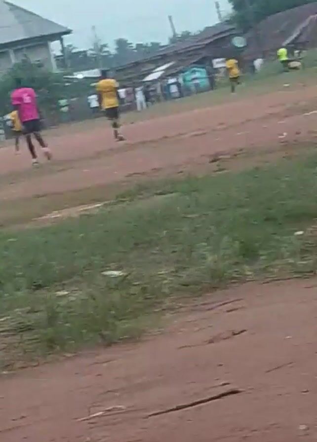 soccer field with players running around in yellow and pink jerseys. Some people are observing the game from the side. The ground is a mix of dirt and grass. A few buildings are visible in the background. The video is shot from a slightly low angle. The overall impression is that of a casual soccer game taking place in a somewhat rural or less developed setting.