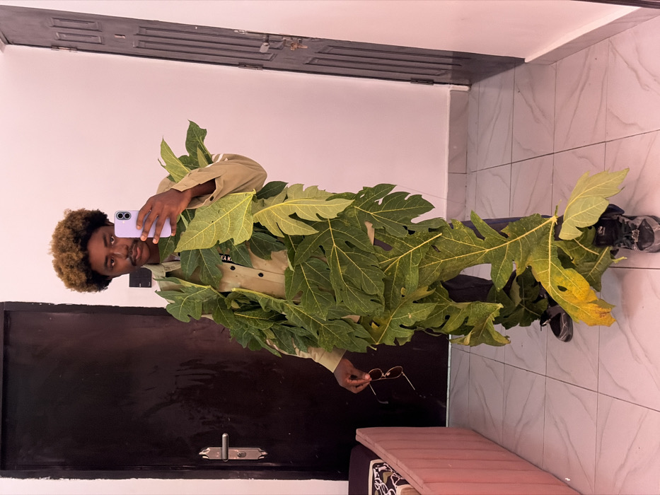 An adult male subject is depicted in an indoor environment in Igboefon, Nigeria. The individual, of dark complexion with dark hair topped with light brown highlights and a mustache, stands centrally, facing forward while taking a mirror selfie. He wears a light brown long-sleeved collared shirt and dark trousers, with dark athletic-style shoes visible. His body is extensively covered from the shoulders down to the lower legs with numerous large, green leaves, some displaying yellowing. In his raised right hand, he holds a light purple smartphone, positioned to capture his reflection. His left hand holds a pair of sunglasses by the temple arms. The background consists of light-colored, possibly pink-toned, walls and a white tiled floor with grey grout lines. To the left, a dark brown wooden door with a silver handle is visible, alongside a segment of pink upholstered furniture. To the right, another dark brown wooden door with a distinct silver handle and locking mechanism is partially visible. The scene is well-lit.