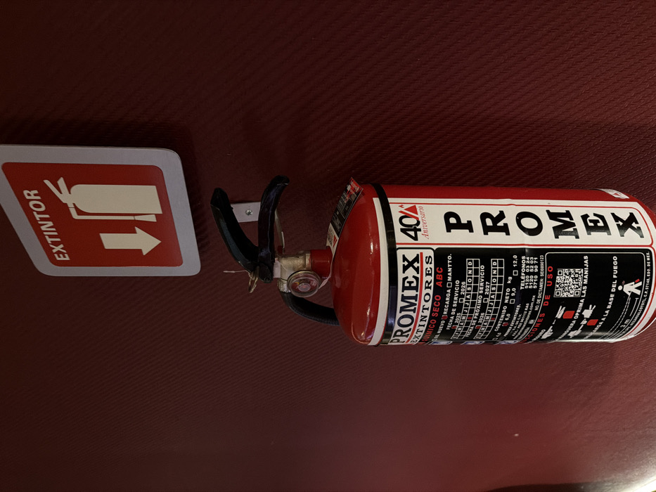 - "A red PROMEX dry chemical ABC fire extinguisher is mounted on a dark reddish-brown textured wall" by FM-okRIy2, licensed under CC BY 4.0