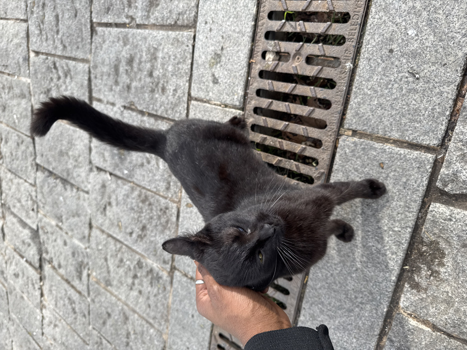 An overhead-angle image depicts a black domestic cat receiving tactile interaction from a human hand on a paved surface in Istanbul, Turkey