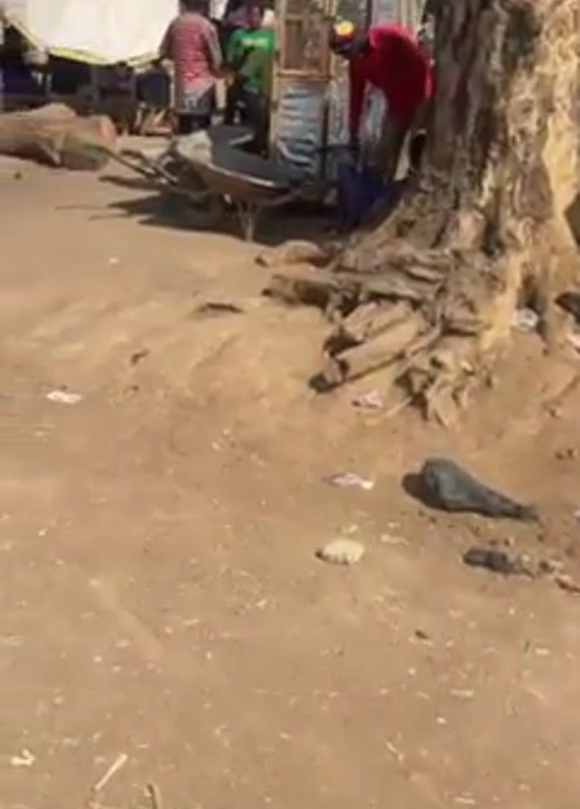 The scene shows a busy outdoor market or gathering place with a large tree in the center. The ground is sandy and covered with debris. Several people are milling around; some are standing near a stall or booth made of corrugated metal and wood. A person wearing a red shirt stands close to the tree. A wheelbarrow is visible, parked nearby. The environment appears to be sunny.