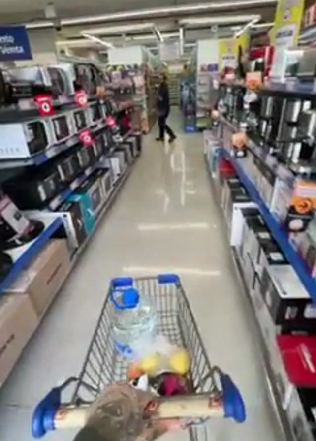 A first-person perspective shows a person pushing a shopping cart down an aisle in what appears to be a department store