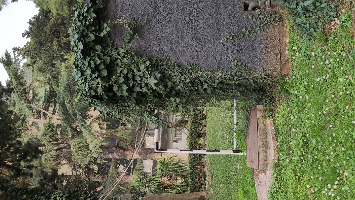 The scene depicts an outdoor area within the city of Budva, Montenegro. A dark grey, textured wall, appearing to be stucco or rough concrete, occupies the right side of the frame, extensively covered on its top and left-facing surfaces by dense green ivy. To the left of this wall, a small, weathered concrete step or platform, topped with a rectangular metallic cover, rests on a ground covered in green grass interspersed with numerous small white flowers. Immediately left of the step, a white vertical pole featuring a distinct black horizontal band is visible, suggestive of a gate frame or small goalpost. In the midground, partially obscured by foliage, a light-colored building with multiple windows and several external air conditioning units is discernible. The background is dominated by a dense arrangement of various green trees, including conifers, indicating a park-like or heavily vegetated urban environment. No individuals are present, and no specific actions or interactions are depicted.