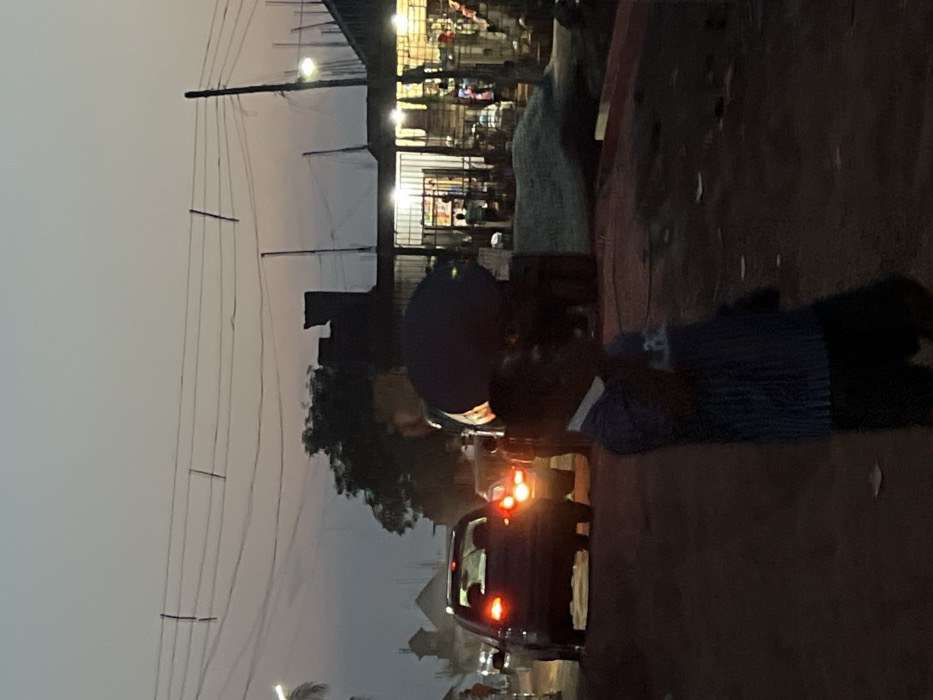 A street scene at dusk features a car with its taillights illuminated in the middle ground. An individual stands partially in the foreground to the right. Overhead electrical lines stretch across the upper left, intersecting with silhouetted buildings and trees in the background. The background shows a more brightly lit building, possibly a storefront, which is contrasted by the dimly lit street.
