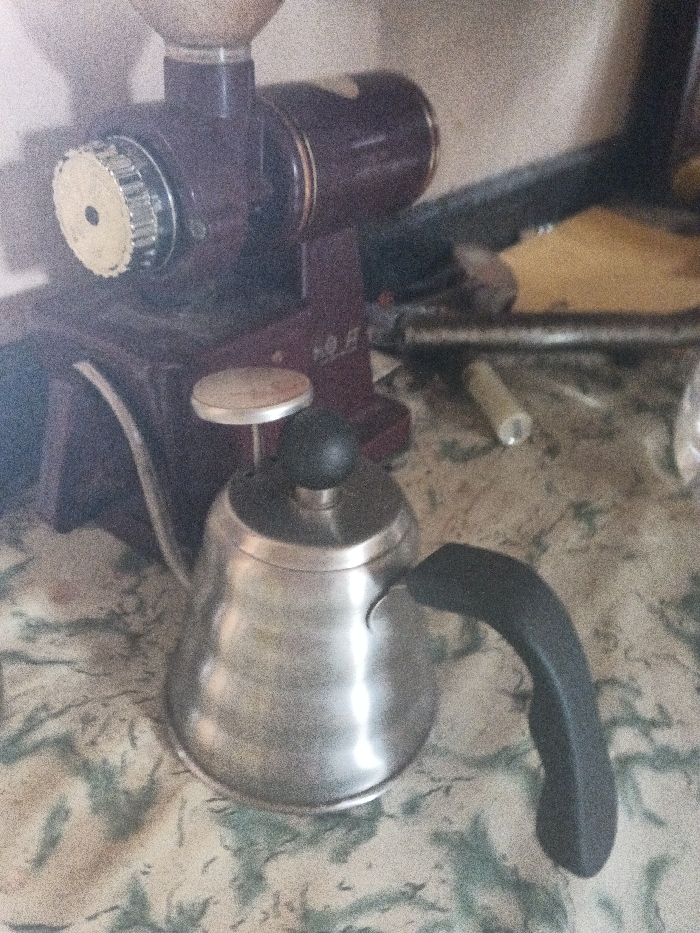 - "The scene, set in Dogsenang Gorphoog, Bhutan, depicts a close-up view of coffee preparation equipment positioned on a mottled green and off-white patterned surface, likely a countertop or table" by FM-Dyp7J3, licensed under CC BY 4.0